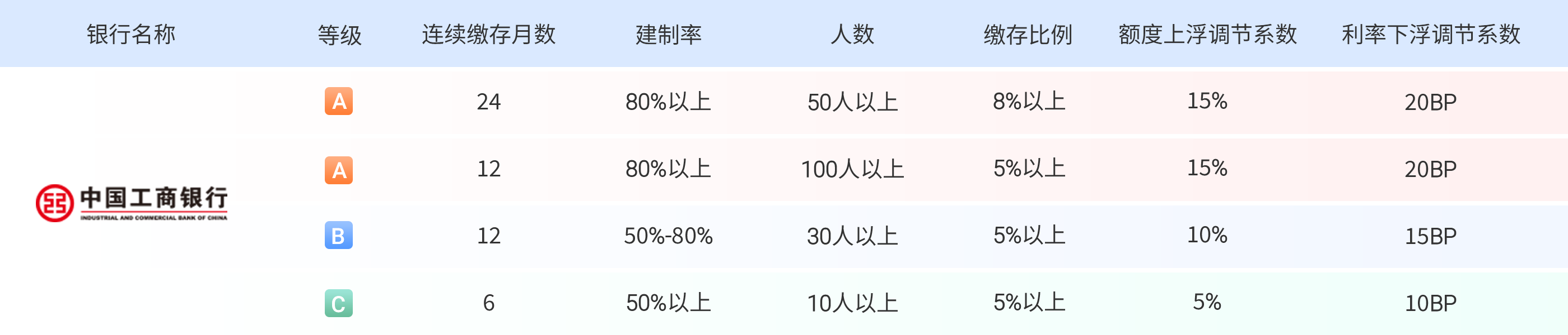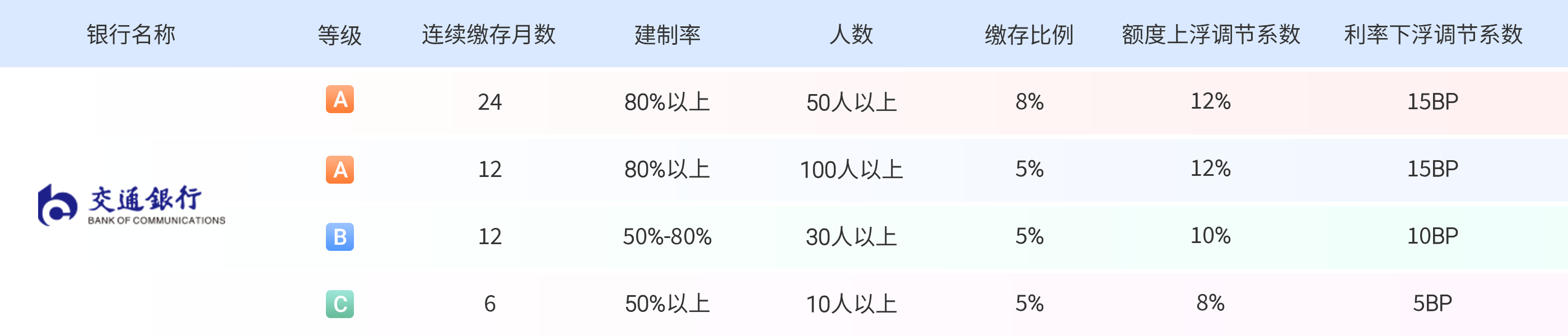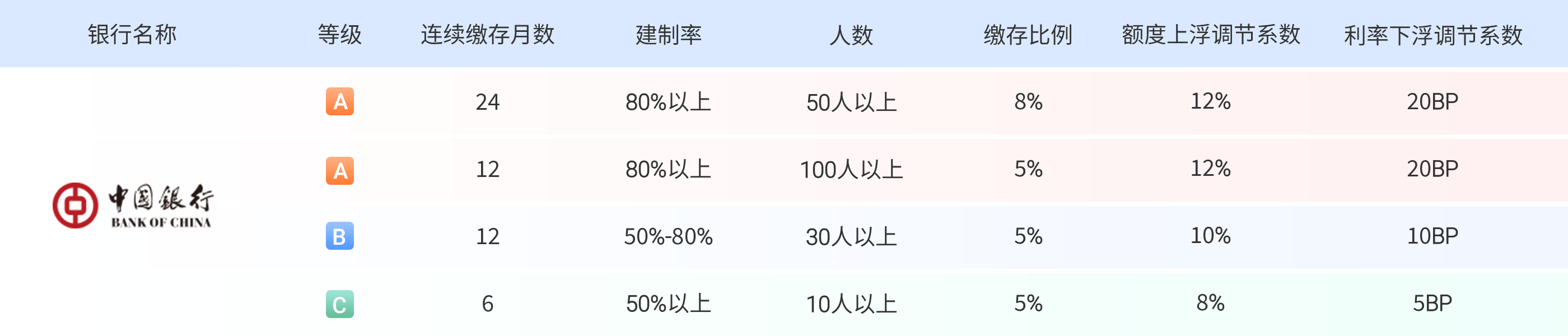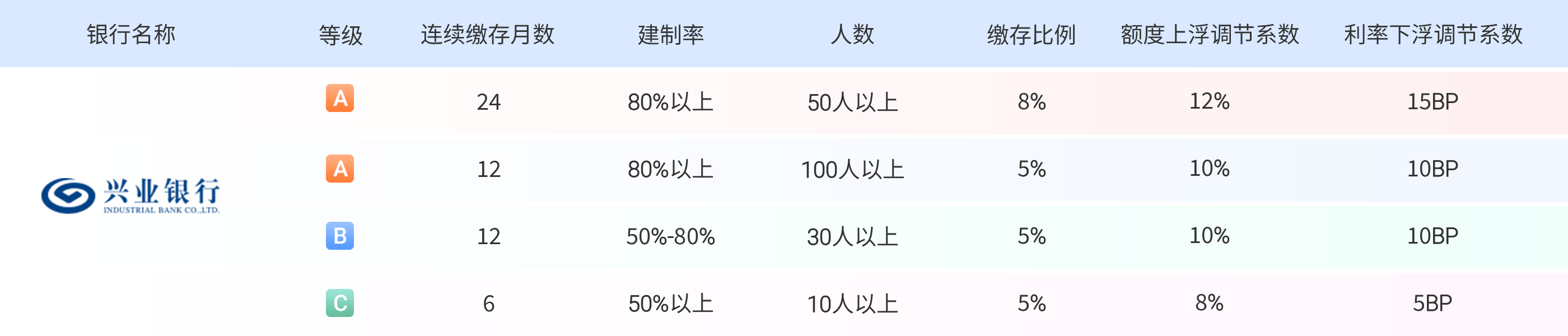 商业银行根据企业住房公积金缴存时间长短、人数多少、比例高低等情况对企业赋予不同评级,企业基于评级可以在原授信基础上享受利率优惠,最多优惠20BP,最少优惠5BP。