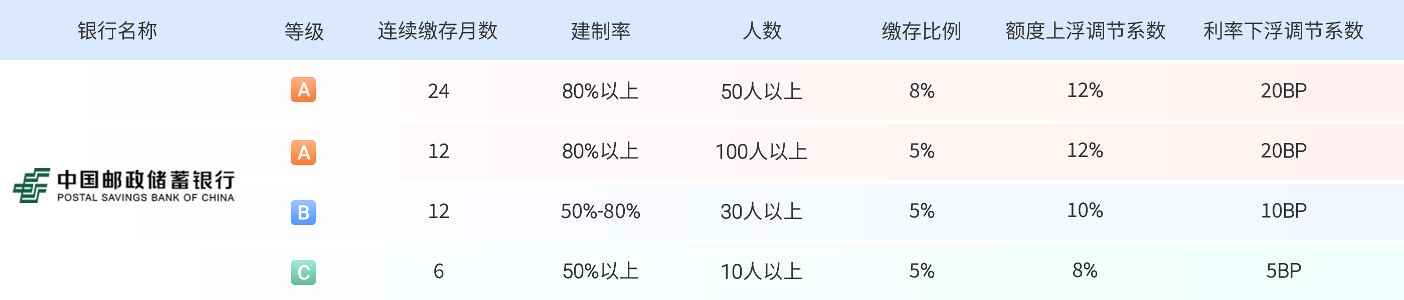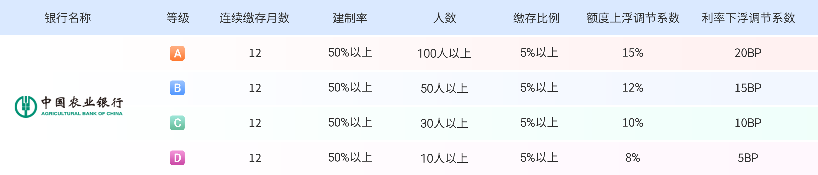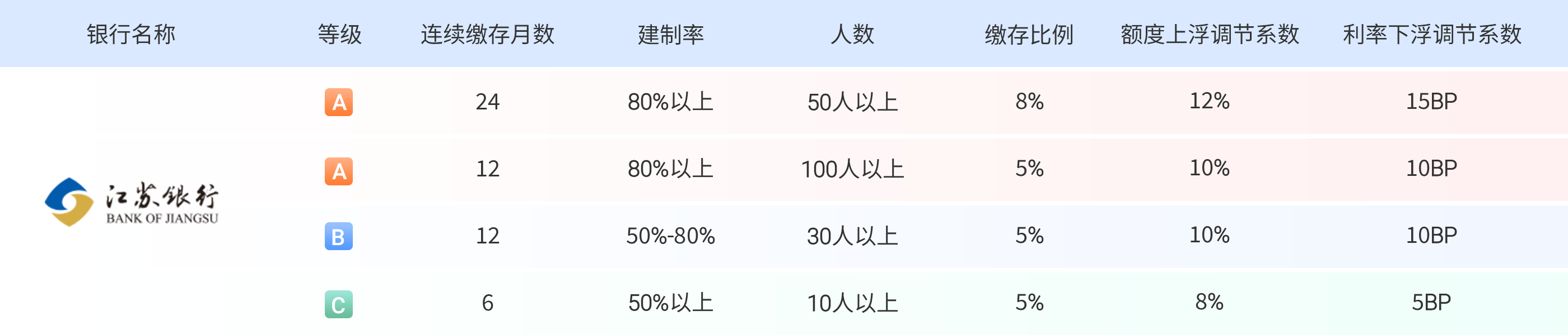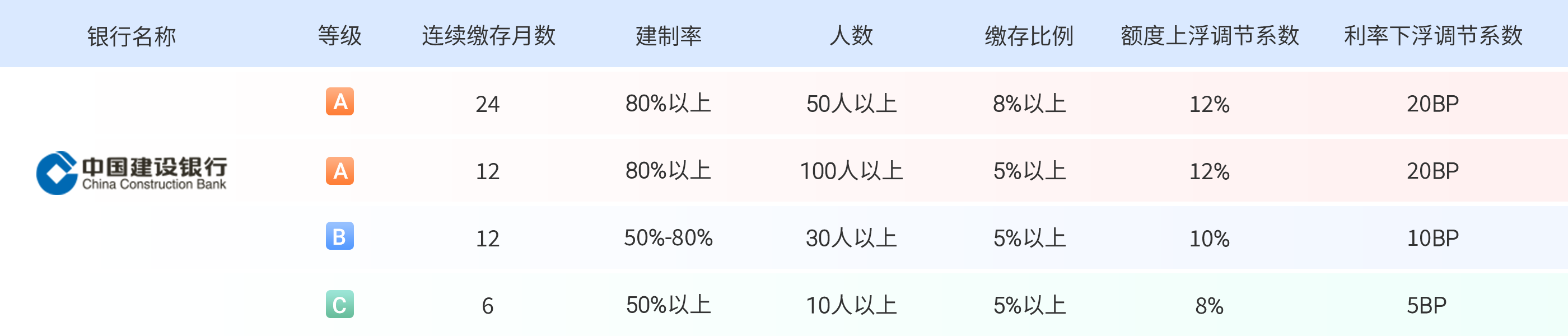 商业银行根据企业住房公积金缴存时间长短、人数多少、比例高低等情况对企业赋予不同评级,企业基于评级可以在原授信基础上享受利率优惠,最多优惠20BP,最少优惠5BP。